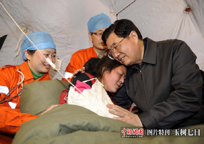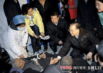 溫家寶在青海省玉樹(shù)縣玉樹(shù)自治州醫(yī)院看望受災(zāi)民眾