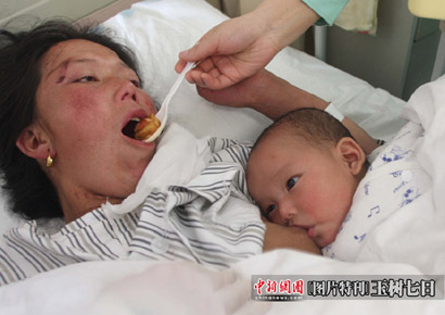 護(hù)士正在給傷員喂飯,懷中4個(gè)月大的孩子在吃奶