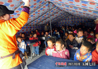 青海玉樹(shù)縣第三完全小學(xué)的帳篷學(xué)堂里學(xué)生們正在上課