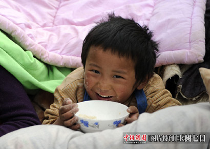 青海玉樹(shù)體育場(chǎng)地震民眾安置點(diǎn)一個(gè)孩子露出笑容