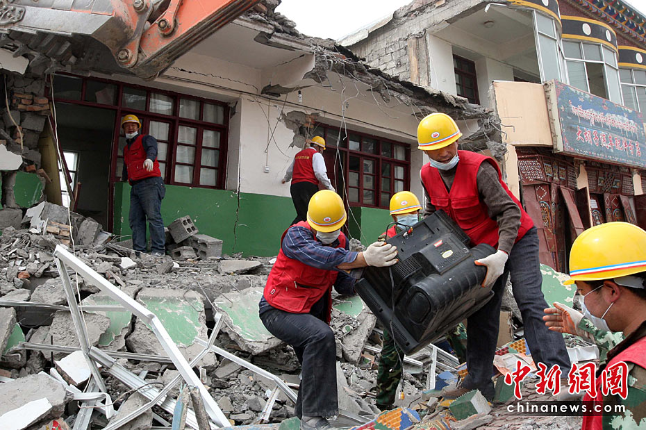 2010年4月19日,青海省玉樹縣結(jié)古鎮(zhèn),一隊唐山農(nóng)民志愿者為受災(zāi)民眾在廢墟中搜尋他們的財物。他們曾經(jīng)參加過汶川地震救援工作。中新社發(fā) 盛佳鵬 攝