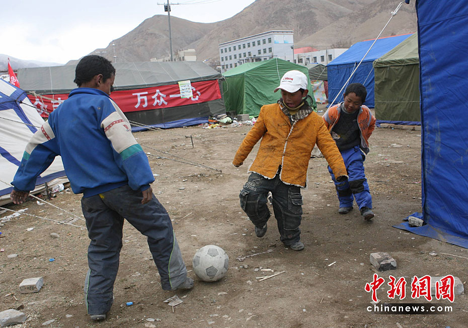 4月20日,青海省玉樹州體育場里,幾名少年在震后搭建的帳篷間踢足球。中新社發(fā) 蘇丹 攝