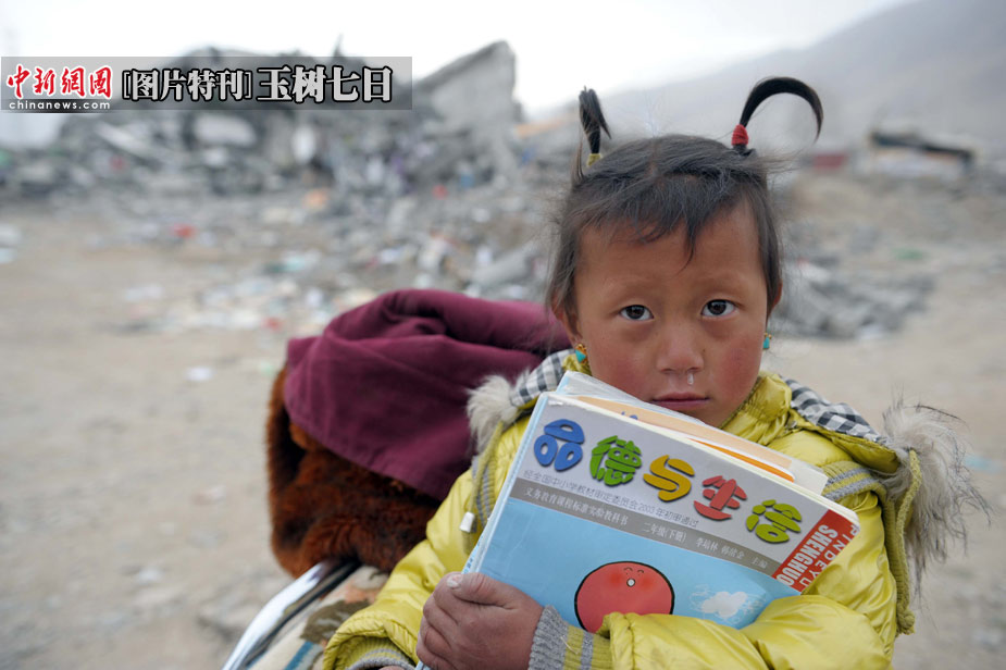 一位上小學(xué)二年級(jí)的女童緊抱著自己的課本,站在震后的廢墟前。中新社發(fā)  陳文 攝