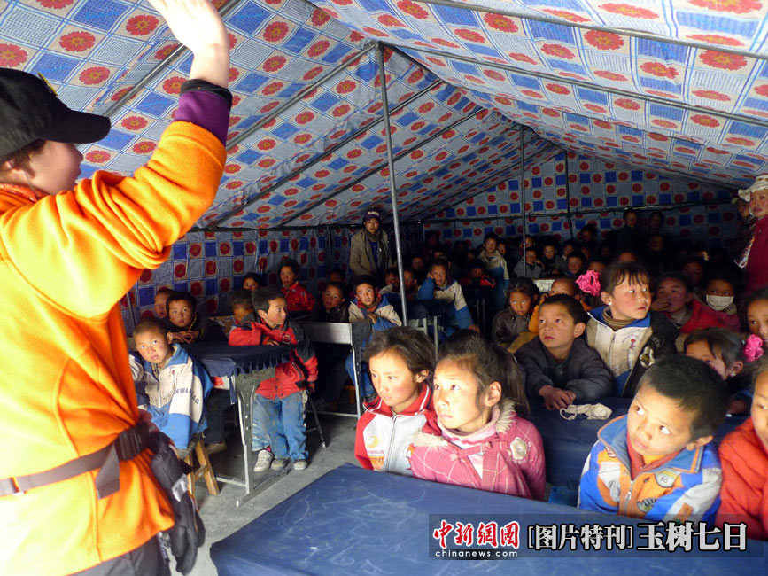 4月19日,青海玉樹縣第三完全小學(xué)的帳篷學(xué)堂里,學(xué)生們正在上課。中新社發(fā) 孫自法 攝