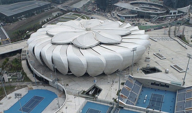 杭州奧體中心網(wǎng)球中心俗稱“小蓮花”,為亞運會網(wǎng)球項目比賽場館及訓(xùn)練場館,位于杭州市濱江區(qū)、杭州城市新中心,距離亞運村約3公里。場館用地面積3.05萬平方米,建筑面積523000平方米,座席數(shù)約10000個。