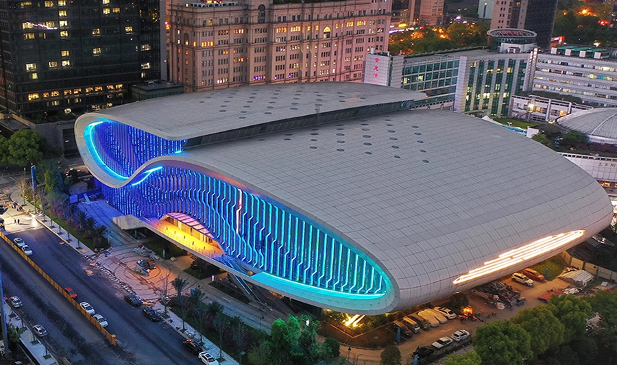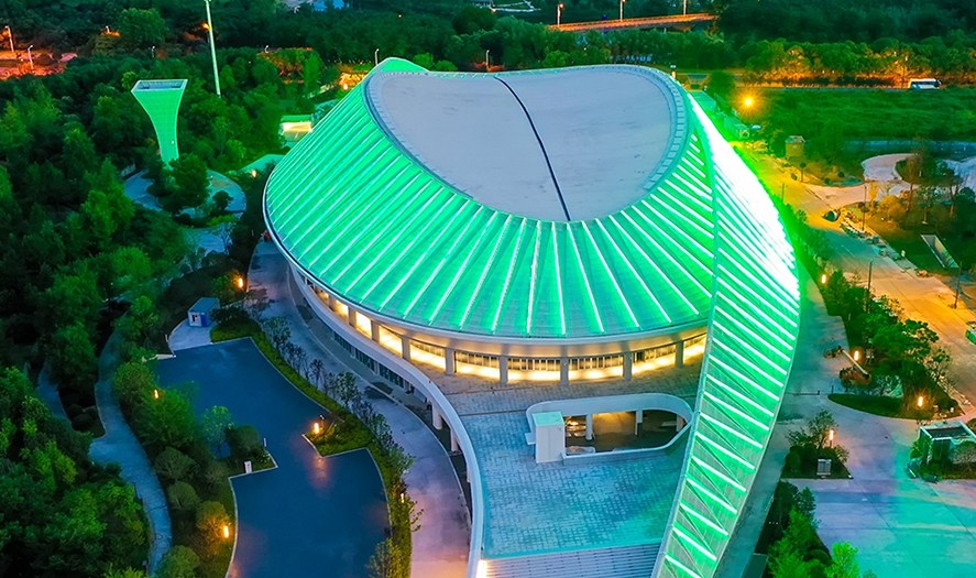 杭州奧體中心游泳館為亞運會游泳、跳水、花樣游泳項目比賽場館及訓(xùn)練場館,位于杭州市蕭山區(qū),總建筑面積53959平方米,觀眾席位數(shù)約6000個,是一個集游泳、跳水比賽和訓(xùn)練為一體的專業(yè)運動場館。場館擁有雙館合一的設(shè)計理念、獨特的流線造型,結(jié)合雙層全覆蓋銀白色金屬屋面,和兩翼張開的平臺形式……作為世界上最大的兩館連接體非線性造型場館,無論白天夜晚,顏值都超高。