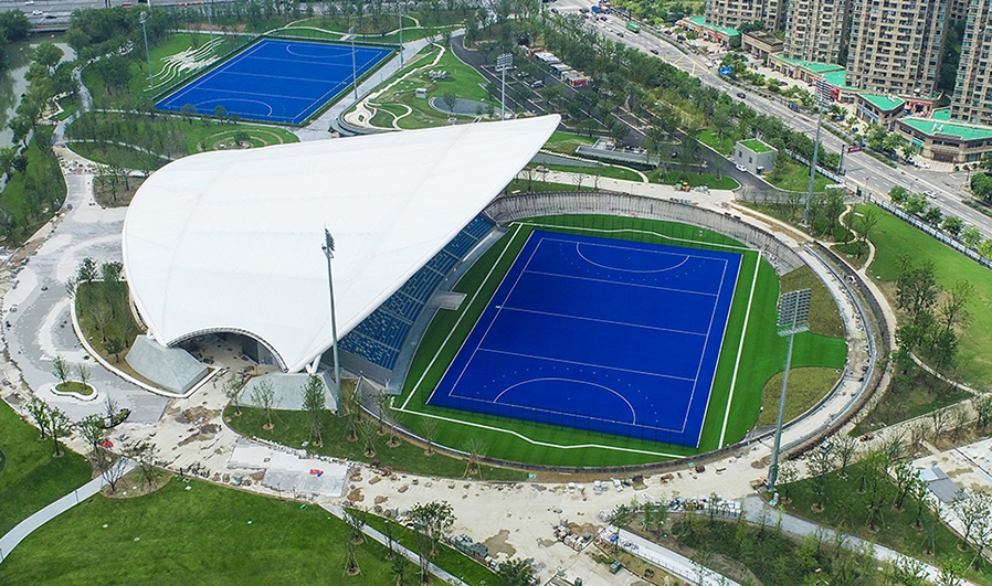 拱墅運河體育公園體育場為亞運會曲棍球項目比賽場地,位于杭州市拱墅區(qū),在亞運村西北方向且相距約14.5公里,含主比賽場和熱身場、兩層賽時配套用房,賽后將作為游客接待中心使用??偨ㄖ娣e27121平方米,觀眾席位數(shù)4870座。